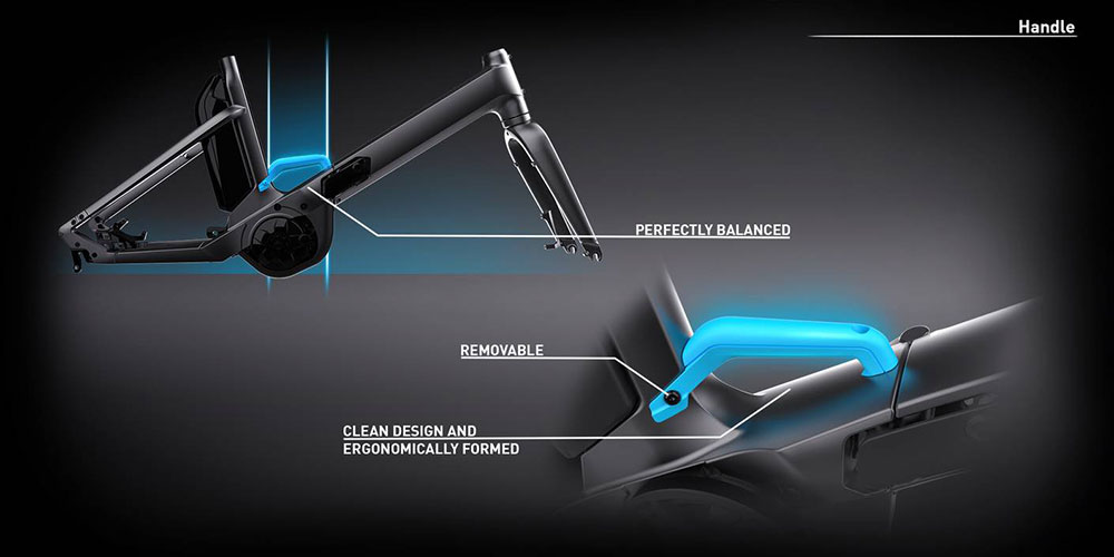 Rahmen: Aluminium Superlite, Comfort Ride Geometry, Semi-Integrated Carrier, Front-Carrier Ready, Slider Dropout, Integrated Folding Technology, Carrying Handlebar