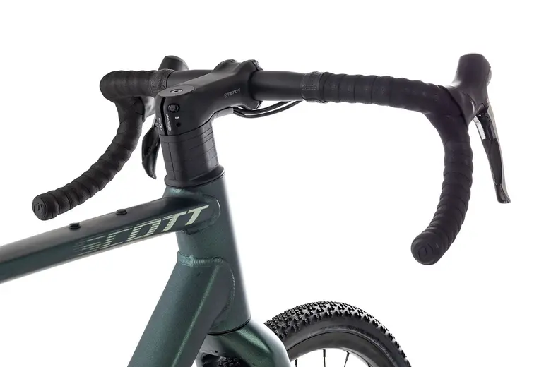 Die Scott Gravel-Geometrie bietet eine komfortable Langstreckensitzposition und Platz für die Verwendung von breiten Gravel-Reifen. Hier bekommst du Schwalbe G-One Bite Performance Reifen. Mit der Shimano Claris Kettenschaltung besitzt dieses Gravelrad 16 Gänge mit ordentlicher Übersetzungsbandbreite. Die 8-fach Kassette bietet eine Entfaltung von 11-32 Zähnen. Solide verzögern die seilzugbetätigten Tektro Scheibenbremsen samt ihrer 160 Millimeter messenden Rotoren.