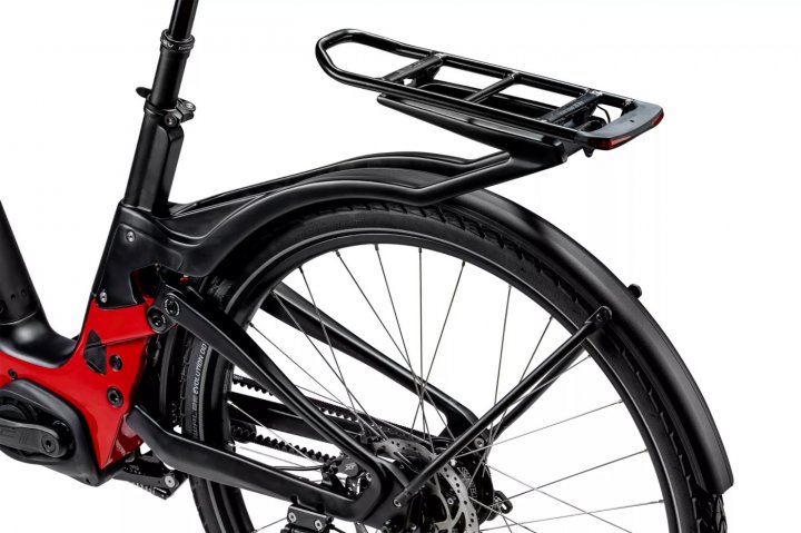 - Ein echter Eyecatcher ist auch der Gepäckträger, der zugunsten einer sicheren Transportfunktion vom Hinterbau entkoppelt ins Design integriert wurde.